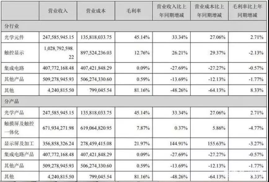 雖然觸控顯示類業(yè)務(wù)是聯(lián)創(chuàng)電子最大的主營業(yè)務(wù),但今年上半年,該公司的光學產(chǎn)品成為光學產(chǎn)品、顯示屏及加工、集成電路產(chǎn)品、其他產(chǎn)品幾大主營分產(chǎn)品中毛利率唯一增加的一個主營產(chǎn)品。
