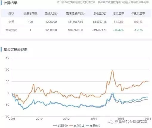 最后,我們以跟蹤上證180指數(shù)走勢的華安上證180ETF基金(510180.OF)為例,對定投ETF策略和前文統(tǒng)計的上交所投資者的盈虧收益進行對比。假設,我們從2008年1月1日,即表1統(tǒng)計的收益率的起始日開始定投,在每月1號購買1萬元的ETF基金份額,每期收到的紅利在下一定投日再投入ETF基金中,截至2017年12月31日,該定投策略的年化收益達到8%(圖5)。鑒于2007-2018年間,上證A股和B股的股息率在1.4%-3.3%之間、均值僅為2.3%,閉著眼定投180ETF的策略反而跑贏了頻繁交易的散戶全收益回報的均值。