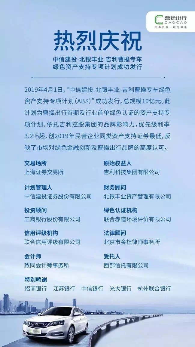 2019年4月1日,“中信建投-北銀豐業(yè)-吉利曹操專車綠色資產(chǎn)支持專項(xiàng)計(jì)劃(ABS)”成功發(fā)行,總規(guī)模10億元。此計(jì)劃為天堂硅谷投資項(xiàng)目曹操出行首期及行業(yè)首單綠色認(rèn)證的資產(chǎn)支持專項(xiàng)計(jì)劃。依托吉利控股集團(tuán)的品牌影響力,優(yōu)先級(jí)利率3.2%起,創(chuàng)2019年民營(yíng)企業(yè)同類資產(chǎn)支持證券最低,反映了市場(chǎng)對(duì)綠色金融創(chuàng)新及曹操出行品牌的高度認(rèn)可。