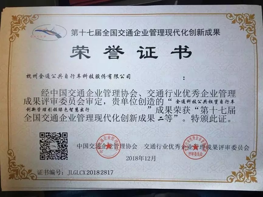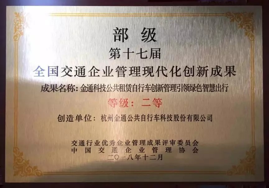 2019年3月14日,中國交通企業(yè)管理協(xié)會在山東濟(jì)南市召開了“第十七屆交通企業(yè)管理創(chuàng)新年會”。會上公布了第十七屆全國交通企業(yè)管理現(xiàn)代化創(chuàng)新成果和示范單位,并對獲獎單位和主創(chuàng)人進(jìn)行了授牌,金通集團(tuán)提交的《金通科技公共租賃自行車創(chuàng)新管理引領(lǐng)綠色智慧出行》榮獲第十七屆全國交通企業(yè)管理現(xiàn)代化創(chuàng)新成果二等獎。